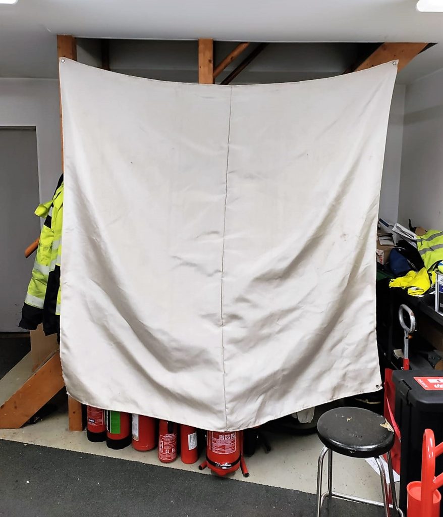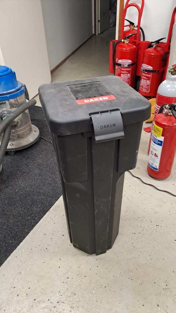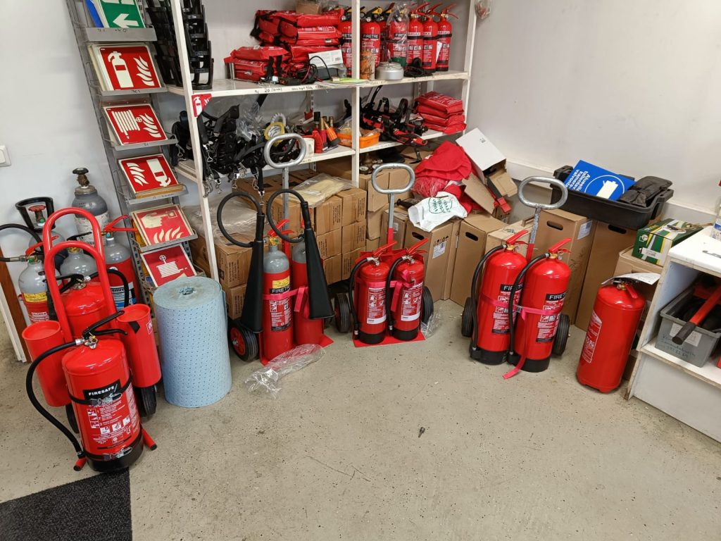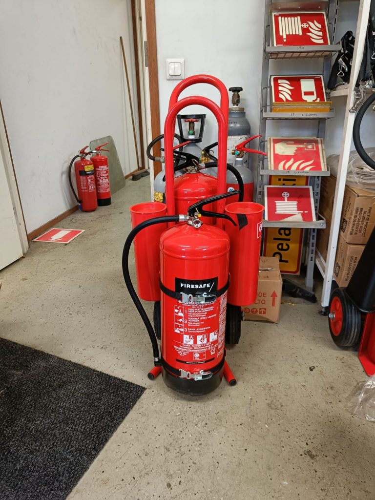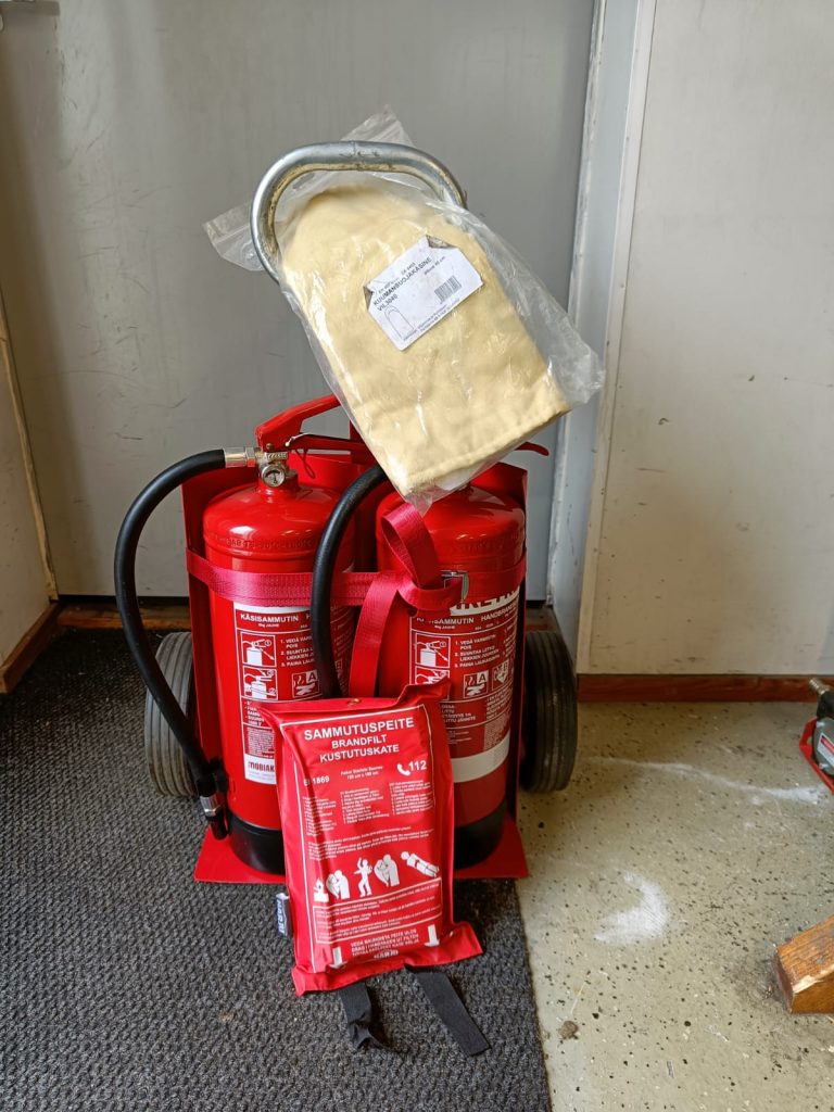 Sammutinkärryt. Sisältää 2×12 jauhesammuttimet, katastrofikinnas ja palopeite.