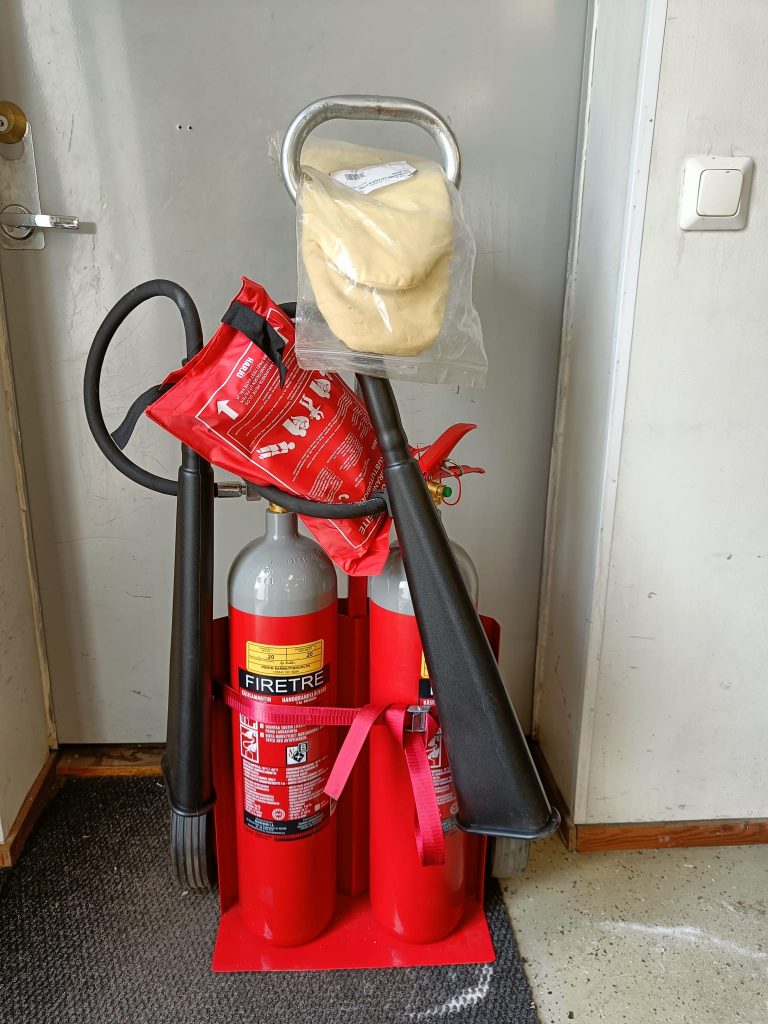 Sammutinkärryt. Sisältää: 2x5kg CO2 sammuttimet, katastrofikinnas ja palopeite.